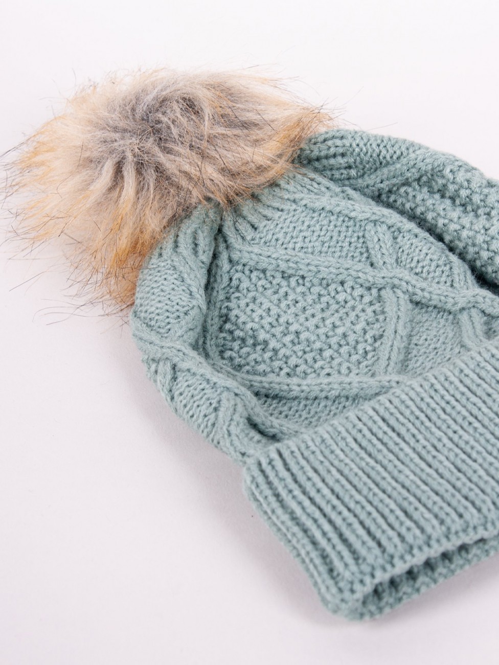 Zimowa czapka dla dziewczynki w kolorze zielonym. O regularnym, warkoczowym splocie. Na górze znajduje się miły futrzany pompon. Zakończona wywinięciem ze splotu ściągaczowego. Czapka jest jednowarstwowa, bez podszewki w środku.
