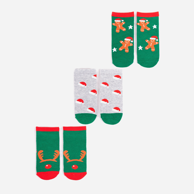 Dziecięce skarpety dostępne w praktycznym trzypaku. Idealne zarówno dla chłopców jak i dla dziewczynek. W kolorze szarym i zielonym, z typowo świątecznymi motywami. Skarpety są miłe w dotyku, dobrze układają się na stopie. Uszyte z miękkiej i zarazem wytrzymałej bawełny, która gwarantuje duży komfort noszenia.