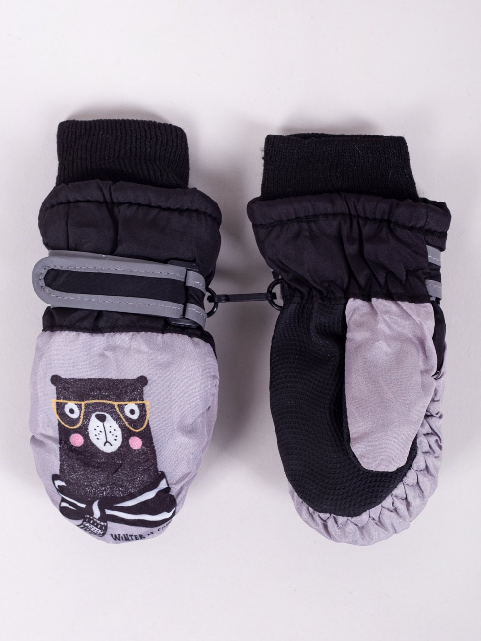 Narciarskie rękawiczki chłopięce w kolorze szaro – czarnym. Na zewnętrznej części ozdobione misiem i napisem: WINTER IS COMING. Wnętrze rękawiczki wykończone miłym polarem.