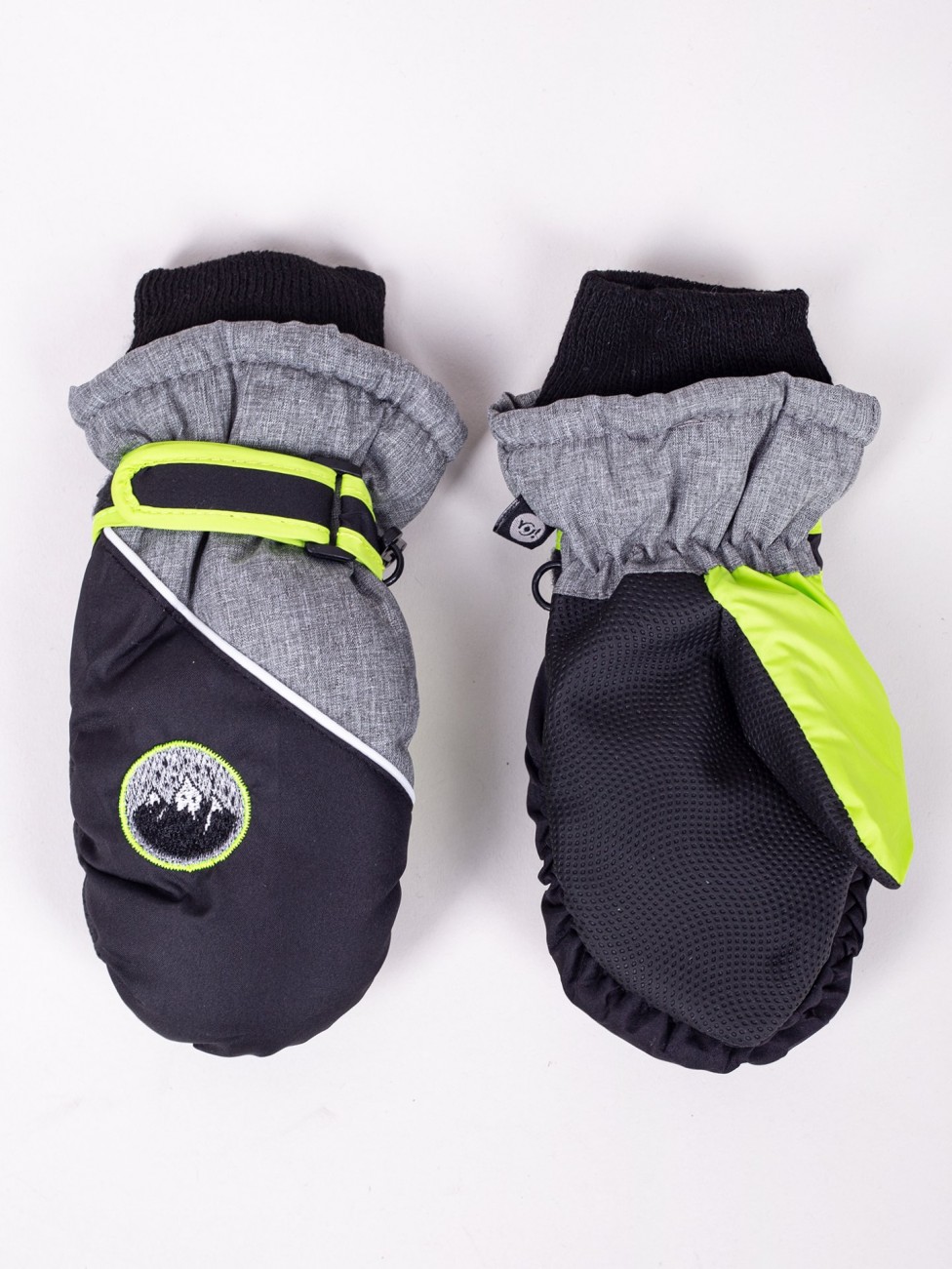 Narciarskie rękawiczki chłopięce w kolorze czarno – szarym z elementami neonowej zieleni. Na zewnętrznej stronie ozdobione naszywką z motywem gór. Wnętrze rękawiczki wykończone miłym polarem.