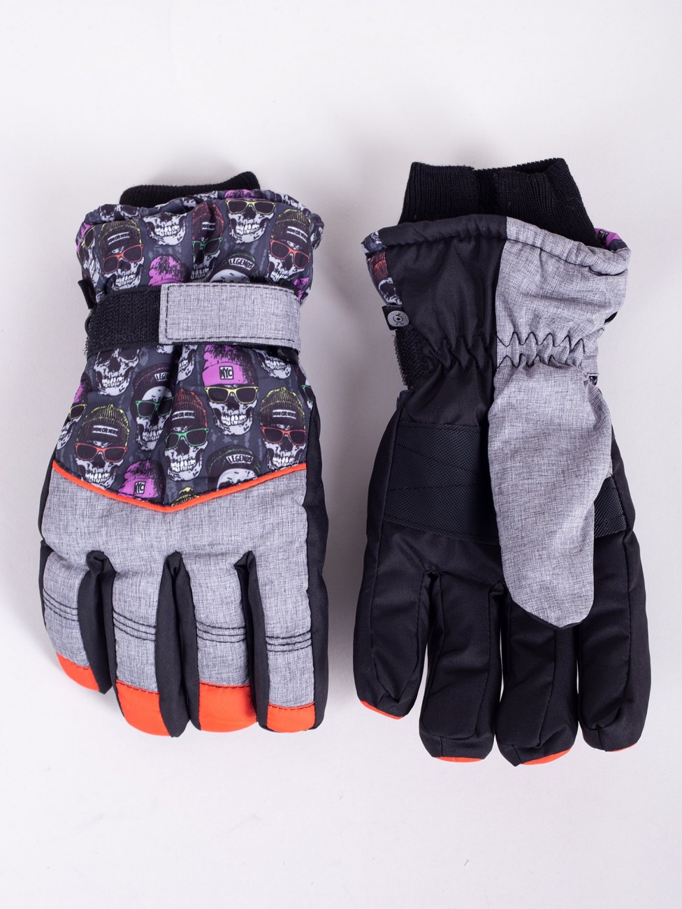 Narciarskie rękawiczki chłopięce w kolorze szaro czarnym z motywem śmiesznych czaszek. Ozdobę stanowią również elementy w kontrastowym intensywnie pomarańczowym kolorze. Wnętrze rękawiczki wykończone miłym polarem.