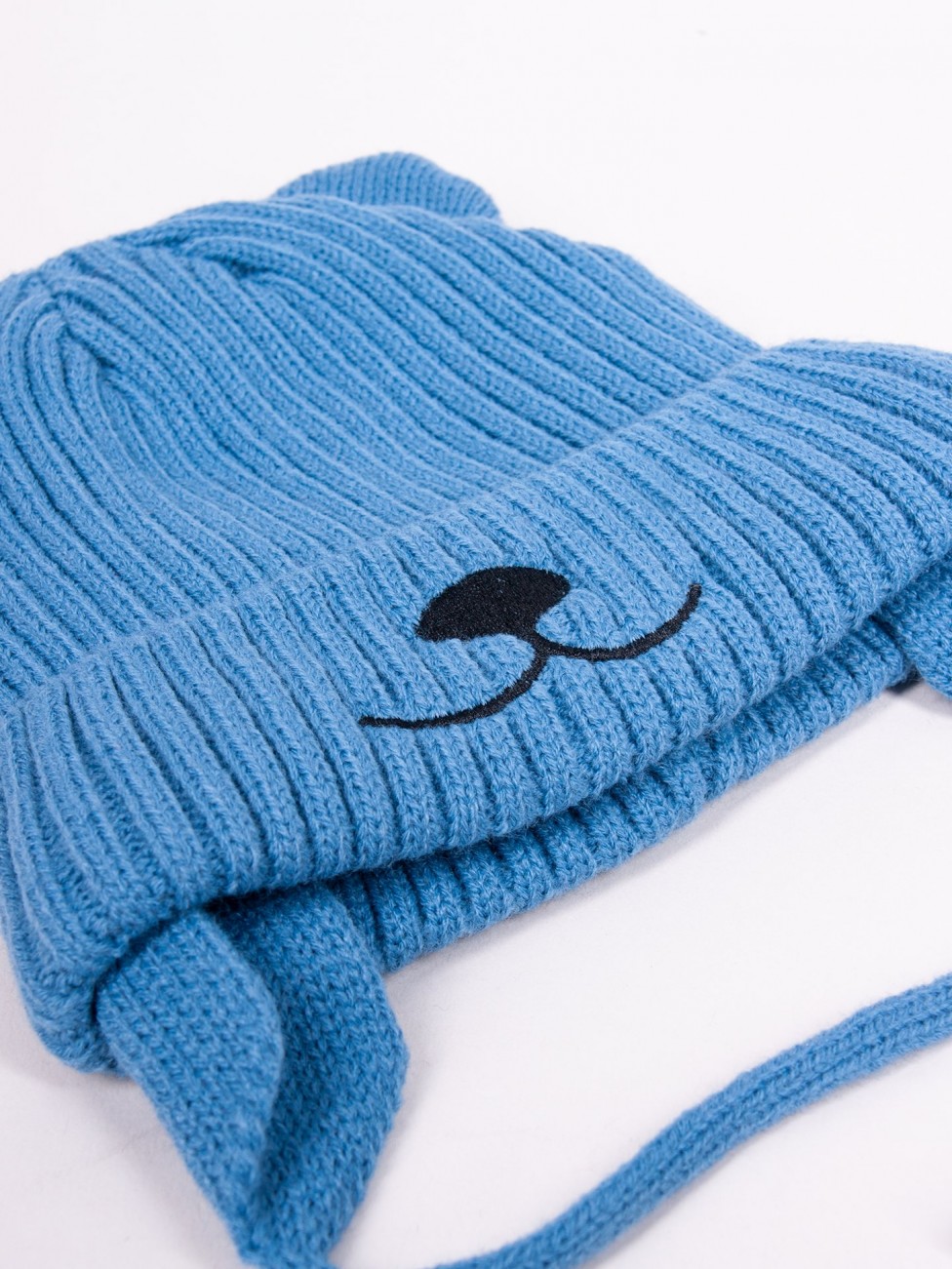 Zimowa czapka dla chłopca w kolorze ciemno – niebieskim. O regularnym, grubym splocie. Na górze znajdują się dwa uszka. Zakończona wywinięciem ze splotu ściągaczowego, na którym widnieje haftowany nosek misia. Trzywarstwowa – w środku posiada ocieplenie oraz bawełnianą podszewkę.