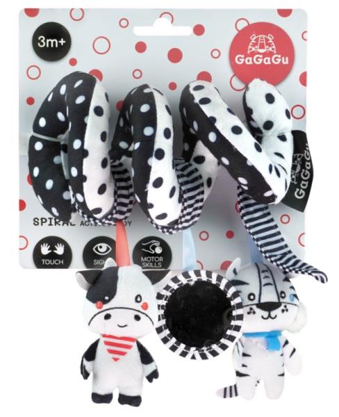 Spirala GaGaGu ma kontrastowe kolory i wzory co stymuluje zmysł wzroku niemowlaka. Pluszowe elementy ? krówka i tygrysek - zachęcają dzieci do ich chwytania, wspierają ćwiczenia tzw. motoryki małej (ruchy dłoni i palców). Na jednej z zawieszek umieszczone jest lusterko, które zwraca uwagę niemowlaka, zachęca do chwytania zawieszki i poznawania swojego odbicia. Kształt spirali pozwala ją opleść na wózku, foteliku, nosidełku lub łóżeczku bez użycia plastikowych elementów. Spirala jest w całości wykonana z materiału, jest bardzo lekka i poręczna, łatwa do przechowywania, idealna do zabrania na spacer czy w podróż. Jest przeznaczona dla dzieci w wieku 3m+ i jest jednym z 12 produktów dostępnych pod marką GaGaGu.