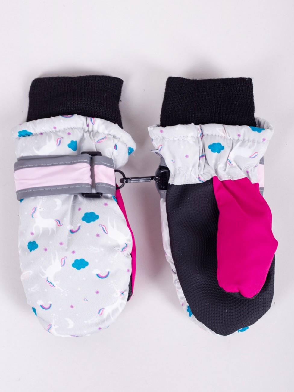 Narciarskie rękawiczki dziewczęce w kolorze szaro - różowym z motywem jednorożców. Wnętrze rękawiczki wykończone miłym polarem.