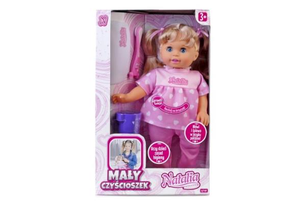 Lalka Natalia Czyścioszek 33cm. Zabawka mówi i śpiewa po polsku oraz uczy zasad higieny. Po przyłożeniu szczoteczki do zębów lalki usłyszymy dźwięk mycia ząbków. Gdy przyłożymy kubeczek, usłyszymy dźwięk płukania. Laleczka zaskoczy dzieci takimi zdaniami jak: "Zawsze myję ząbki rano i wieczorem" lub "Podaj mi kubeczek". Do zestawu dołączono wyjątkowe akcesoria: szczoteczka, kubeczek, ściereczka. Laleczka jest ubrana w uroczą piżamkę w serca. Wszystko zapakowano w pudełko z okienkiem. Produkt posiada funkcję "wypróbuj mnie!".