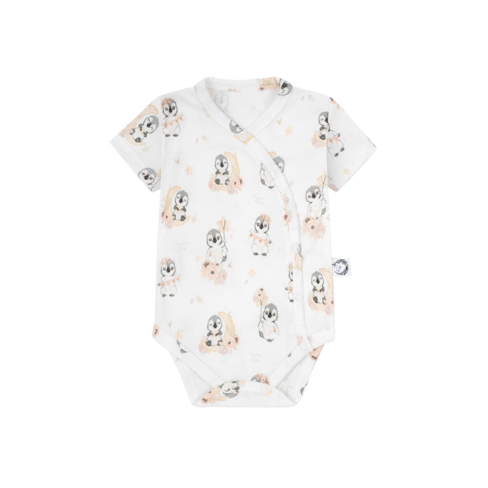 Rozpinane body dla niemowląt uszyte z miękkiego i delikatnego materiału, bardzo przyjemnego w dotyku. Ze starannie wyselekcjonowanej bawełny organicznej. Body zapinany jest na antyalergiczne bezniklowe napy. Wygodne kopertowe zapinanie sprawia, że jest bardzo proste do zakładania dla rodziców.