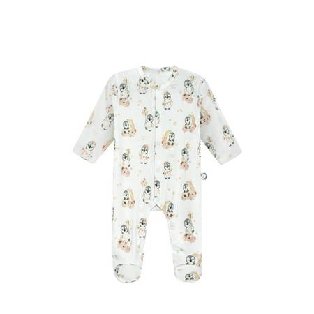 Rozpinany pajac dla niemowląt uszyty z miękkiego i delikatnego materiału, bardzo przyjemnego w dotyku. Ze starannie wyselekcjonowanej bawełny organicznej. Pajac zapinany jest na antyalergiczne bezniklowe napy.