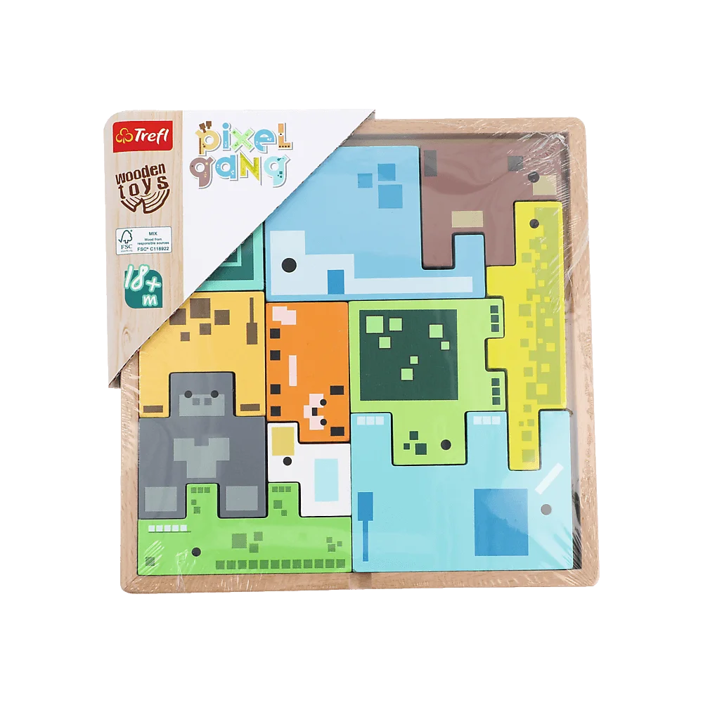 Pixel Gang to drewniana łamigłówka, która polega na ułożeniu klocków w kształcie pikselowych zwierzątek, tak aby wypełniły całą ramkę. Kontury znajdujące się na podstawce ułatwiają zadanie. Z łamigłówką poradzą sobie dzieci już od 18. miesiąca życia. Drewniane zwierzęta mogą również posłużyć za figurki do zabawy.