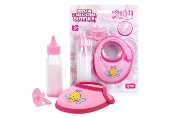 Zestaw z magiczną butelką(Natalia), w kolorze różowym. W zestawie znajduje się smoczek, śliniaczek z grafiką kolorowej pszczółki oraz butelka z mlekiem(12cm). Wystarczy przechylić butelkę a płyn zniknie, ustaw butelkę pionowo a butelka ponownie zostanie napełniona. Wymiary opakowania: 21,5x14x4,5cm. Wiek: 3+.
