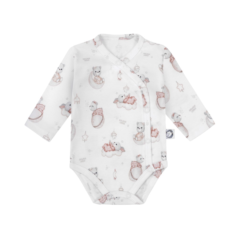 Rozpinane body dla niemowląt uszyte z miękkiego i delikatnego materiału, bardzo przyjemnego w dotyku. Ze starannie wyselekcjonowanej bawełny organicznej. Body zapinany jest na antyalergiczne bezniklowe napy. Wygodne kopertowe zapinanie sprawia, że jest bardzo proste do zakładania dla rodziców.