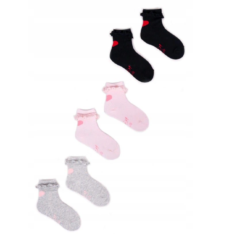 Dziewczęce skarpety dostępne w praktycznym trzypaku. W kolorach: róż, szary i czarny, pasującym do wielu stylizacji i do wielu okazji. Idealnie sprawdzą się podczas wszelkich uroczystości czy sesji zdjęciowych.