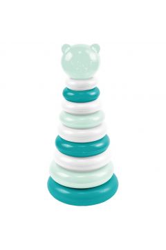 Misiowa Piramidka w kolorze nasyconego turkusu, mlecznej mięty oraz bieli, składa się z podstawy ze słupkiem, na który dziecko nakłada różnej wielkości kółka, w kolejności od największego do najmniejszego, na końcu nakłada ostatni element, główkę misia, która wieńczy całą budowlę. Dziecko podczas zabawy ćwiczy precyzyjne ruchy dłoni, koordynację ręka-oko niezbędną do wykonywania podstawowych czynności oraz do nauki pisania i rozwija zmysł logicznego myślenia. W trakcie zabawy piramidką dziecko uczy się rozpoznawania kolorów i rozróżniania wielkości (małe, mniejsze, najmniejsze). Na kolorowych kółkach wchodzących w skład zestawu maluch będzie mógł potrenować umiejętność chwytania, tę bardzo podstawową, ale arcyważną umiejętność, dzięki której będzie mógł samodzielnie wykonywać wiele czynności takich jak np. picie czy jedzenie. Zestaw wyróżnia się jakością wykonania, oryginalną kolorystyką oraz estetycznym wyglądem.