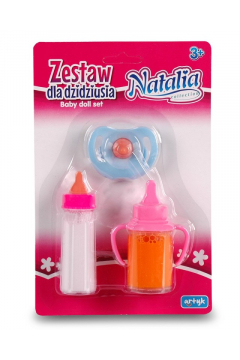 Zestak akcesoriów dla lalki - bobasa. W zestawie: smoczek, butelka z mlekiem, kubek z sokiem. Wymiary: 21 x 14 cm. Wiek: 3+