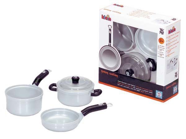 Zestaw małego kucharza lub kucharki, w skład którego wchodzą patelnia, głęboki rondel oraz garnek z przezroczystą przykrywką. Idealnie pasuje do wszystkich kuchni firmy Klein. Garnki sprawiają wrażenie stalowych, a świetna jakość i grubość tworzywa, z którego zostały wyprodukowane sprawiają, że posłużą do zabawy (także intensywnej) przez bardzo długi czas.