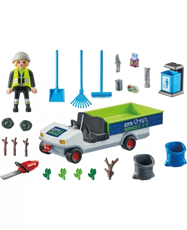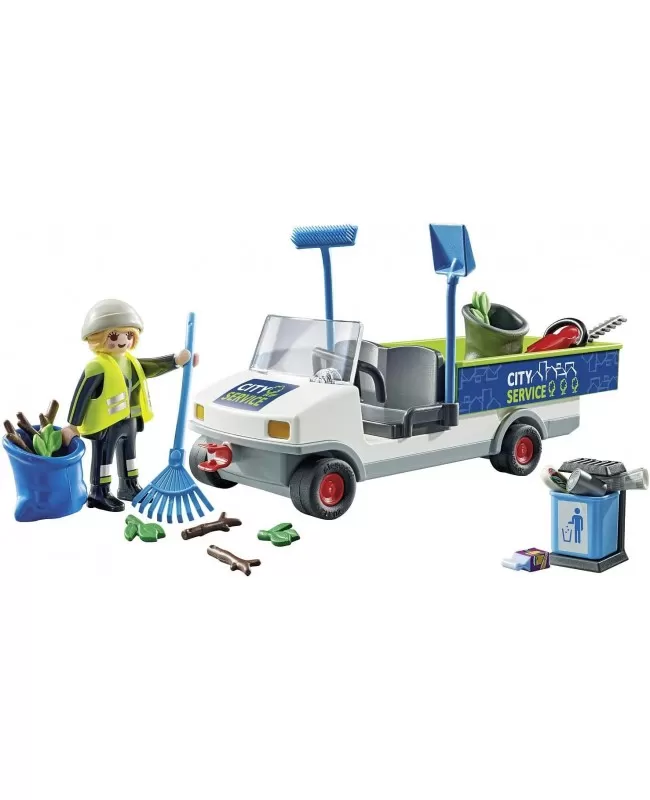 Oddany zespół sprzątający miasto każdego dnia z zaangażowaniem pracuje nad utrzymaniem czystości w PLAYMO City. Firma sprzątająca ulice do transportu śmieci wykorzystuje pojazd elektryczny. Po opróżnieniu wszystkich pojemników na śmieci i zebraniu wszystkich worków na śmieci następuje wyjazd na składowisko. Dzięki realistycznie zaprojektowanym zestawom do czyszczenia ulic PLAYMOBIL City Action dzieci w wieku 4 lat i starsze mogą w domu bawić się recyklingiem i miłością do środowiska. Zestaw zawiera figurkę PLAYMOBIL, miniaturowy samochód, kosz na śmieci, łopatę, miotłę i wiele innych akcesoriów umożliwiających autentyczne odgrywanie ról.