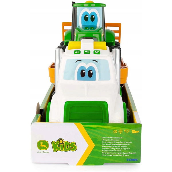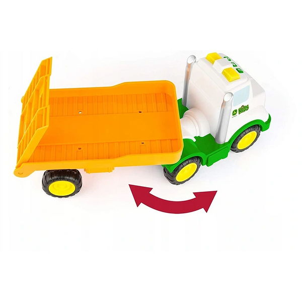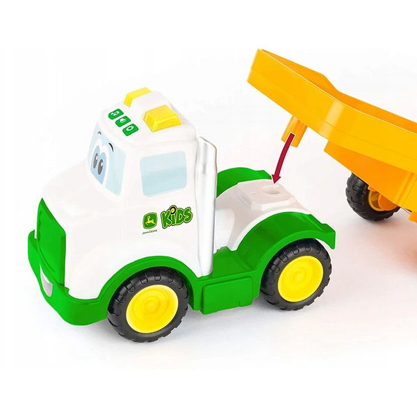 Zestaw składa się z trzech części, a są to: ruchomy traktor z obrotowym wysięgnikiem oraz sterowanej ciężarówki z rampą i przyczepą. Pojazd możemy wykorzystać również do przewożenia innych modeli, co pozwoli na liczne odgrywanie scenek z ciągnikiem w roli głównej. Wyposażony w światło i dźwięk zapewni wiele godzin wspaniałej zabawy, pobudzającej zmysły.
