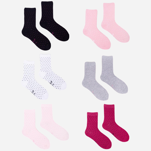Dziewczęce skarpety dostępne w praktycznym sześciopaku. W stonowanej, wesołej kolorystyce, ozdobione na całości delikatnymi kropeczkami. Posiadają klasyczny krój, za kostkę. Są miłe w dotyku, dobrze układają się na stopie.