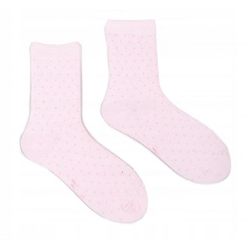 Skarpetki w stonowanej, wesołej kolorystyce, ozdobione na całości delikatnymi kropeczkami. Posiadają klasyczny krój, za kostkę. Są miłe w dotyku, dobrze układają się na stopie.