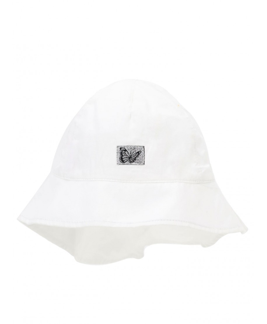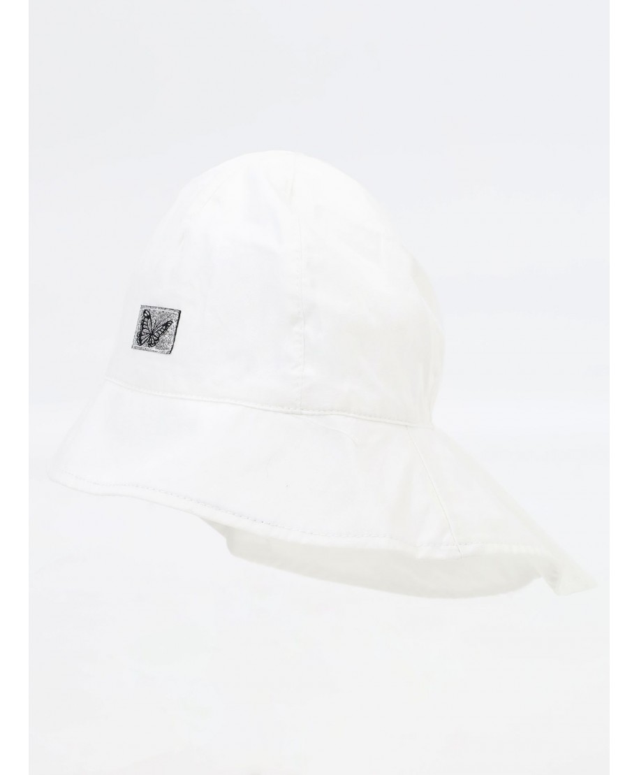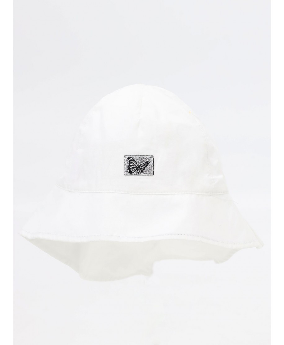 Dziewczęcy kapelusz letni w kolorze białym. Z przodu ozdobiony subtelną naszywką z motywem motylka.