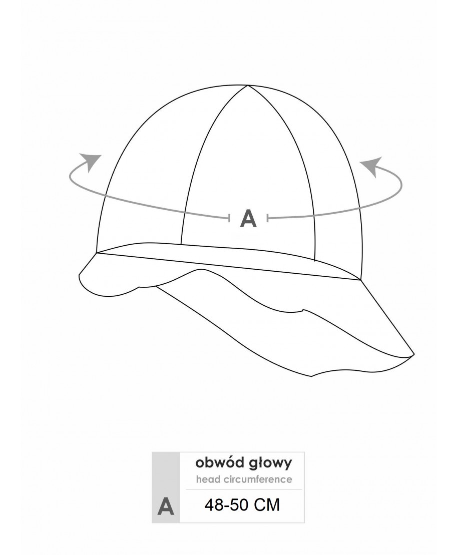 Kapelusz posiada rondo, które zapewni dodatkowy cień i osłoni oczy dziecka przed promieniami słonecznymi. Z tyłu wyposażony w osłonę na kark i uszy, zaprojektowaną tak, by nie ograniczała widoczności i jednocześnie zapewniała dopływ powietrza do delikatnej skóry dziecka.
