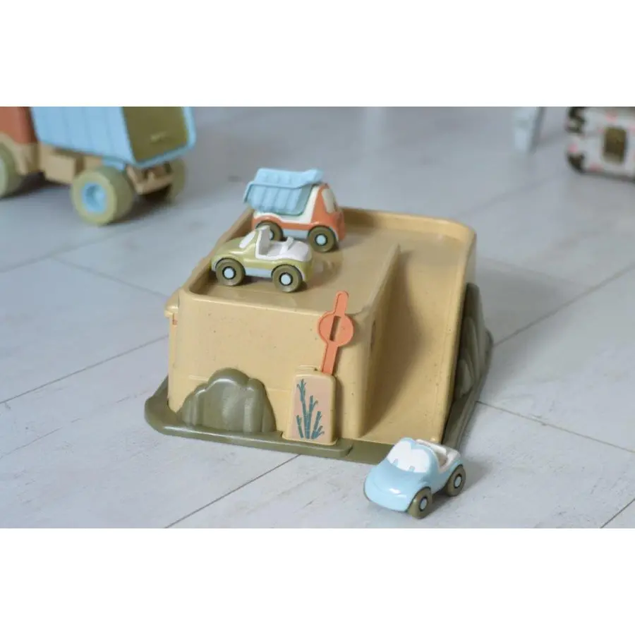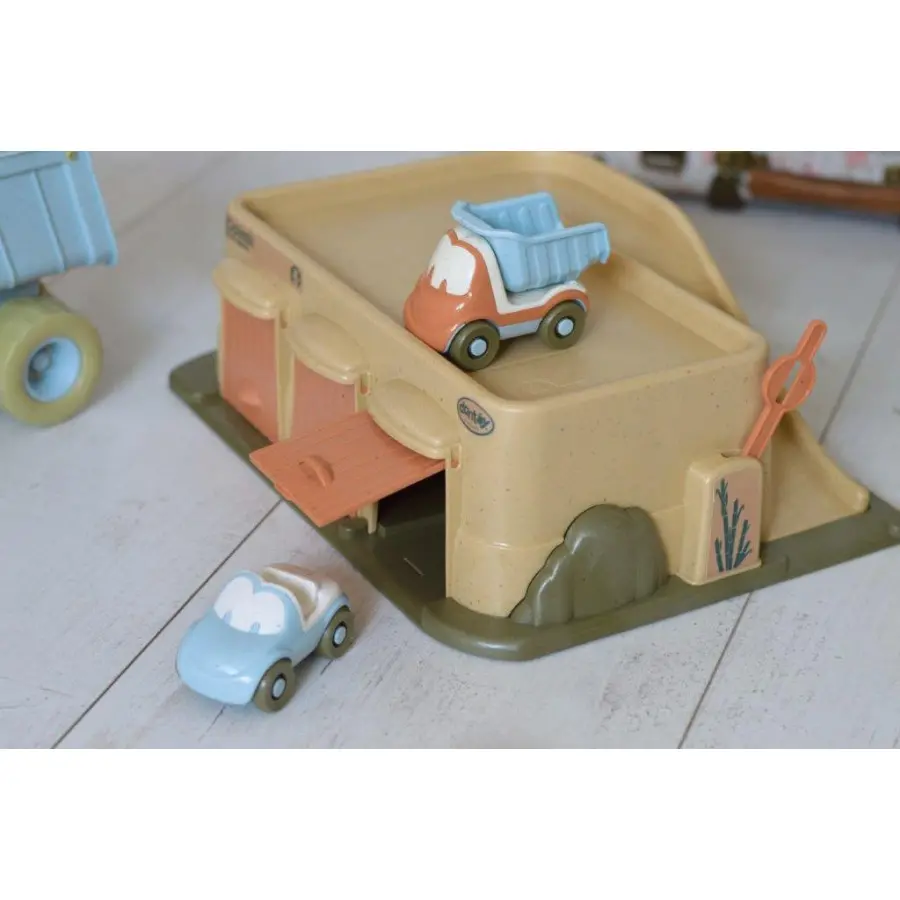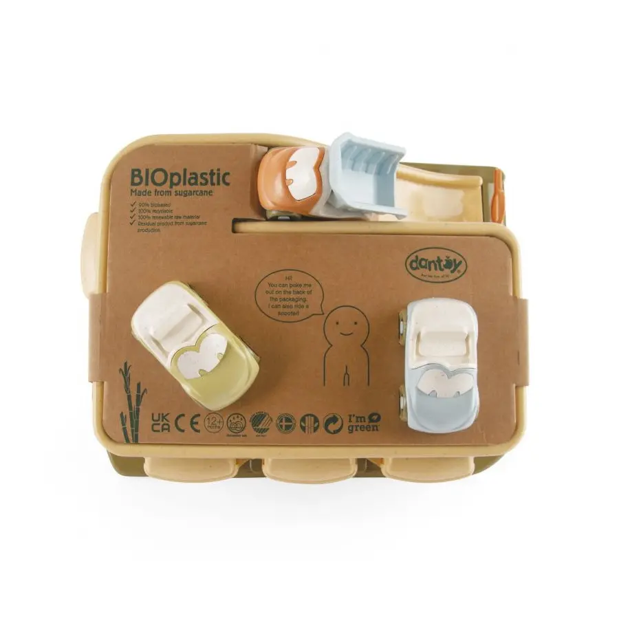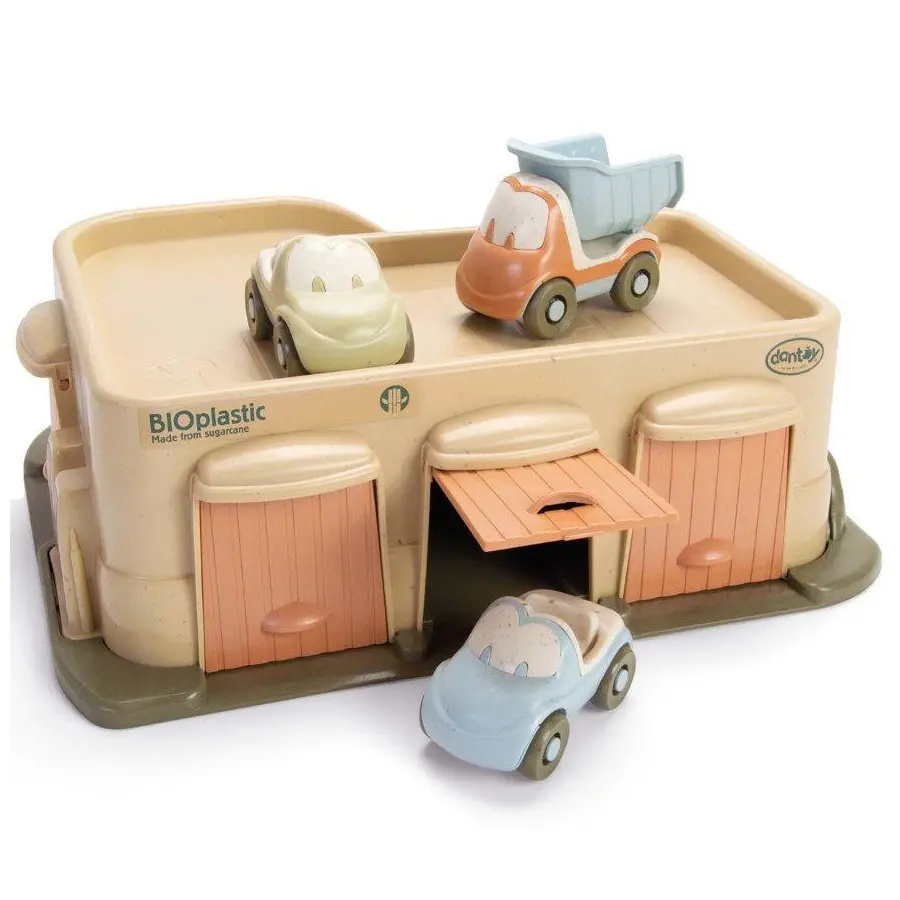 Zabawki DANTOY z linii BIO powstają w trosce o środowisko i przyszłość najmłodszych pokoleń! Garaż ze zjeżdżalnią i miejscem na dachu w stonowanych kolorach dla trzech małych uroczych autek, które należą do kompletu. Każde auto ma swoje miejsce parkingowe po podniesieniu bram garażowych. Łącznie 4 otwierane bramy, dystrybutory paliwowe i podnoszony szlaban. Zestawem można bawić się w pomieszczeniu jak i na zewnątrz. Po przejechaniu przez piaskownicę lub kałuże, samochody są łatwe do wyczyszczenia.