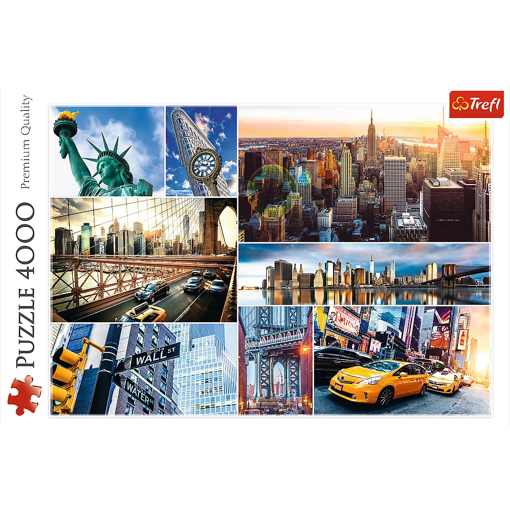 Puzzle 4000 elementów z kolażem wspaniałych zdjęć przedstawiających charakterystyczne miejsca Nowego Jorku - Manhattan, Wall Street, Statua Wolności. Po ułożeniu powstanie plakat o wymiarach 136x96 cm. Wysoką jakość, nasycenie kolorów i bezpieczeństwo układania zapewnia kalandrowany papier odbijający światło, pokryty ekologicznymi farbami spożywczymi.