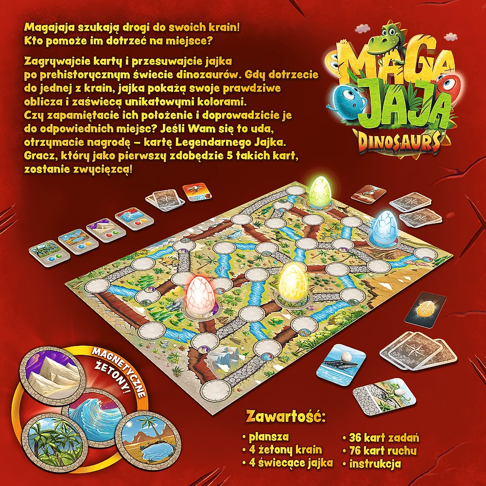 Gracze zagrywają karty i przesuwają jajka po prehistorycznym świecie dinozaurów. Kiedy dotrzecie do jednej z krain, jajka pokażą prawdziwe oblicza i zaświecą unikatowymi kolorami. Czy zdołacie zapamiętać ich położenie i doprowadzić do odpowiednich miejsc?
