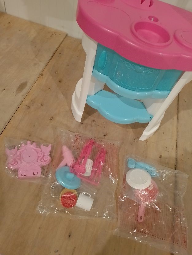 Wśród 22 akcesoriów znajduje się: patelnia, pokrywka, 2 talerze, sztućce (łyżeczki, widelce, noże,sztućce do gotowania), 2 kubki, 2 szklanki, tarty i produkty spożywcze.