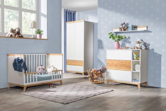 Niskie nogi komody o grubości 18 mm tworzą stabilną i niewywrotną podstawę z drewna jesionowego.W trosce o zdrowie użytkowników wszystkie elementy drewniane wykończone są bezbarwnym lakierem, bezpiecznym dla zdrowia dziecka. Pozostałe elementy komody na skośnych nóżkach to wysokiej jakości biała płyta laminowana o grubości 18 mm – łatwa w utrzymaniu czystości. W szufladach zastosowano prowadnice kulkowe z systemem cichego otwierania – na docisk. Przezroczysty kolor lakieru uwidacznia nasycenie barw drewna i podkreśla jego słoje.