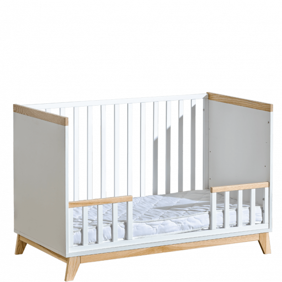Gustowne, łóżeczko dziecięce 120×60 Nordik z funkcją sofy, na wzór nordyckiego trendu. Mebel dzięki swojej funkcjonalności i solidnego wykonania spełnia podstawowe oczekiwania dziecka jak i rodzica. Łóżeczko z trzema poziomami regulacji spodu pod materac oraz z trzema wyciąganymi drążkami. Gdy mały właściciel wyrasta już z wieku niemowlęcego proponujemy zdemontować jeden bok ze szczebelkami. Wysoki element zastępujemy niską ochronną barierką przykręcaną do pełnych boków łóżeczka. Barierka w takiej samej tonacji kolorystycznej nada wręcz prestiżowego znaczenia zmienionego łóżeczka w oczach dziecka, zapewniając mu poczucie niezależności.