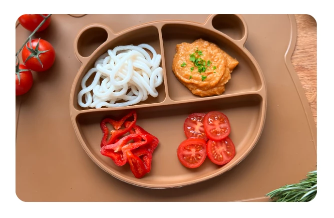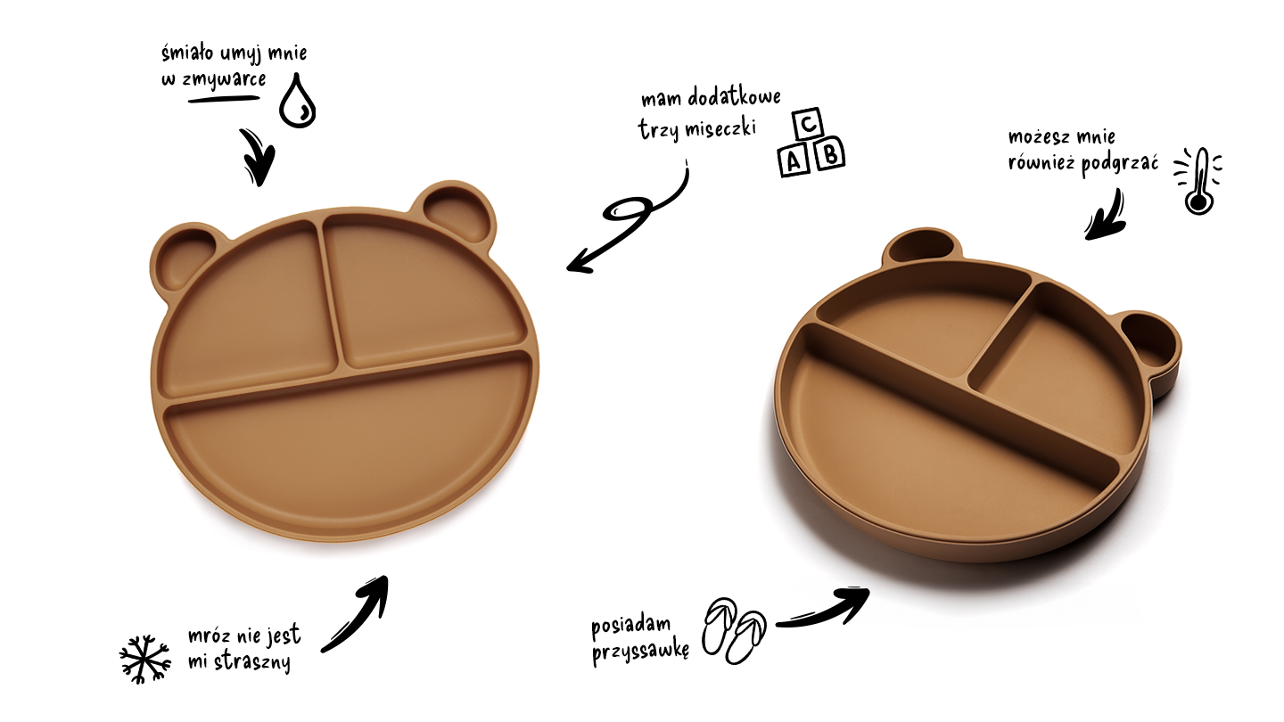 Talerzyk z trzema przegródkami w kształcie misia urozmaica każdy posiłek. Dzięki antypoślizgowej powierzchni, talerzyk zapewnia stabilność posiłków minimalizując ryzyko przewrócenia się, co ułatwia samodzielne jedzenie maluchom.