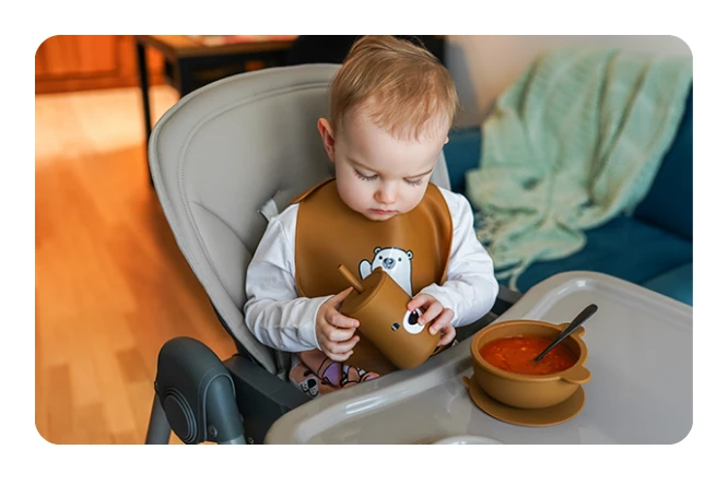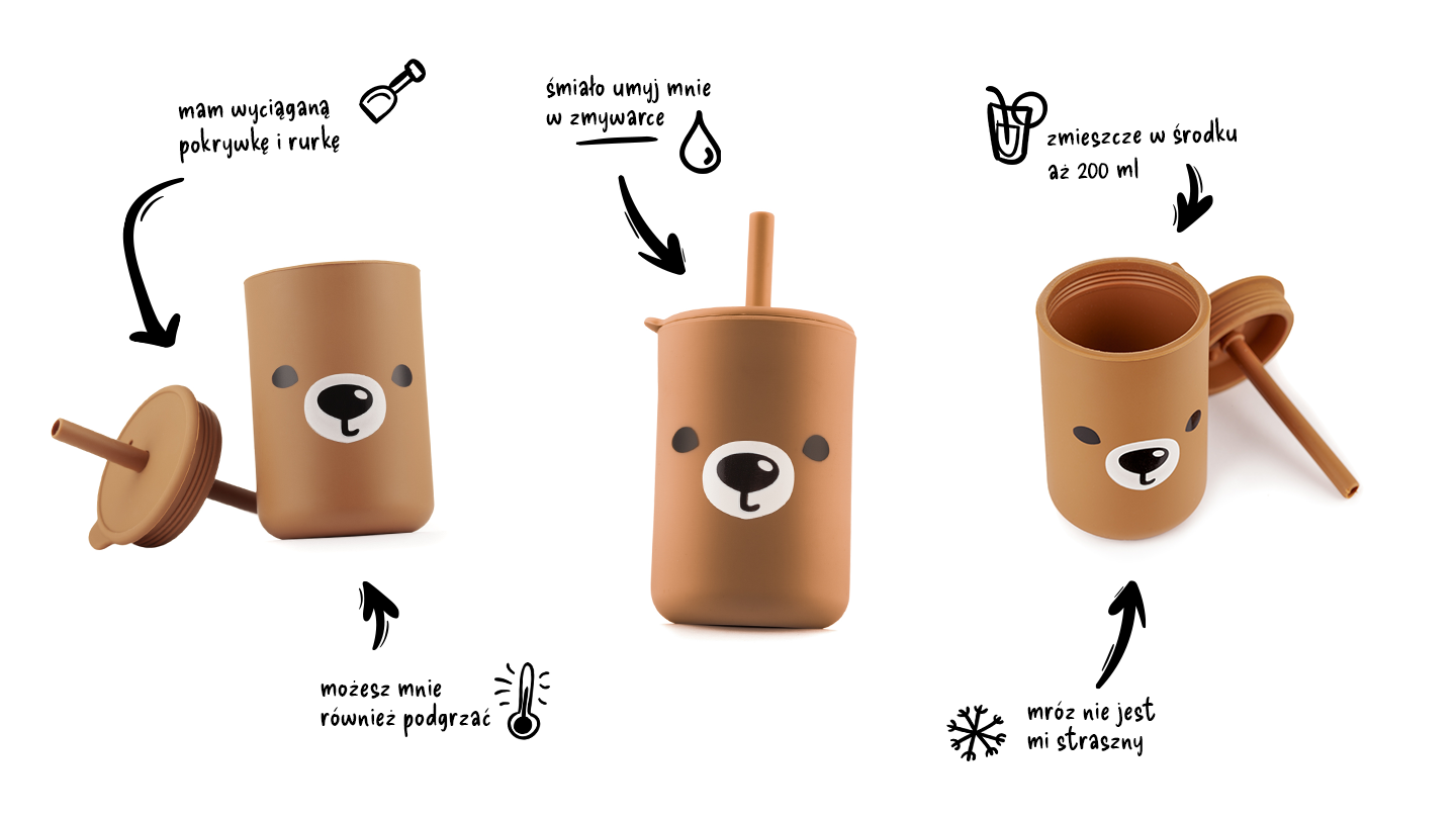 Kompaktowy kubek silikonowy z motywem misia, wyposażony w przykrywkę oraz silikonową słomkę. Idealnie sprawdzi się w podróży. Jest bezpieczny, hipoalergiczny i łatwy w czyszczeniu.
