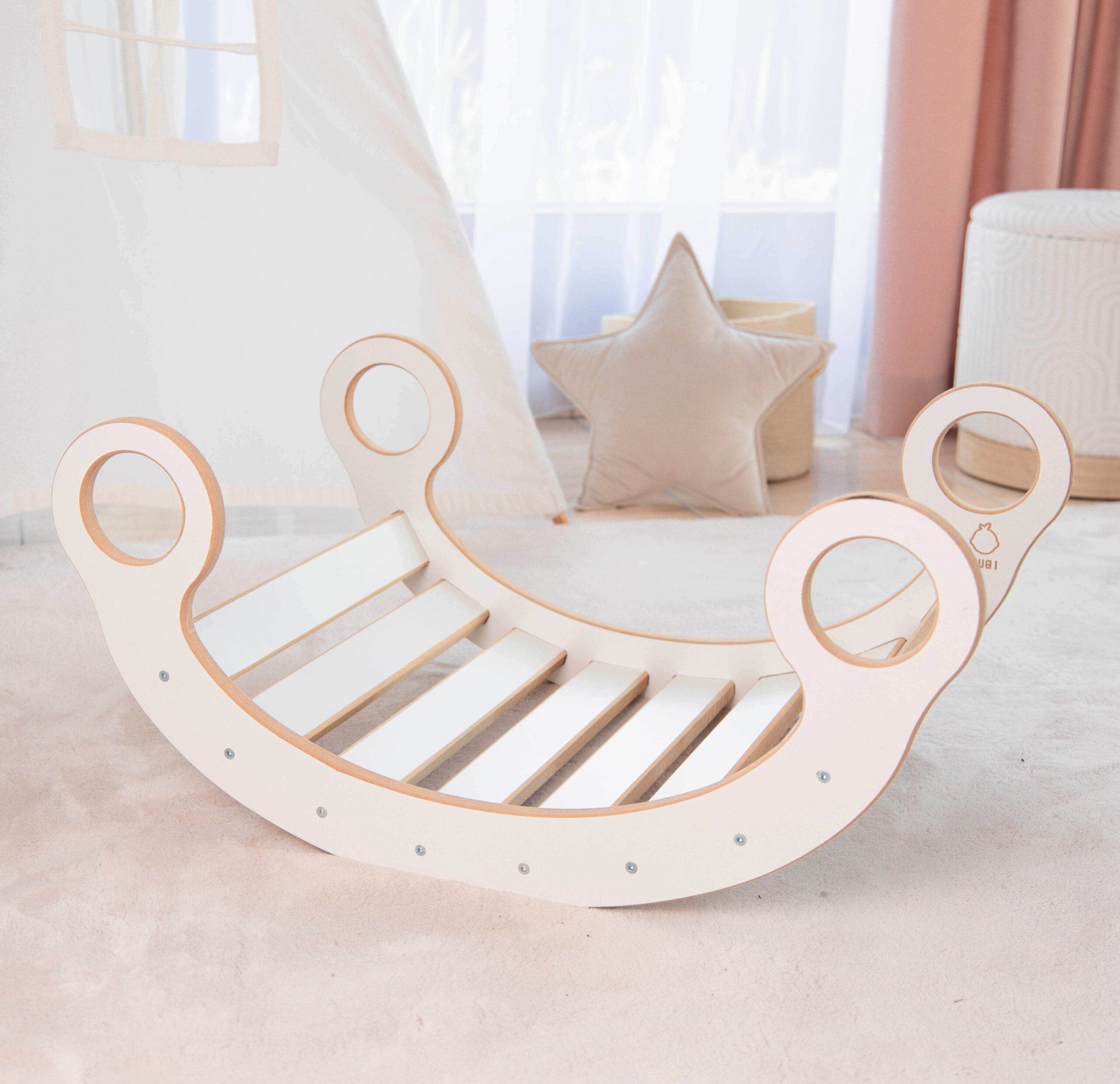 Oto drewniany Bujak Montessori, niezwykła zabawka dla dzieci, która stymuluje ich wyobraźnię i rozwija różnorodne umiejętności. Ten innowacyjny bujak może być używany w dwóch ustawieniach: jako klasyczna huśtawka lub jako most. Jego zastosowania są ograniczone jedynie przez dziecięcą kreatywność.
