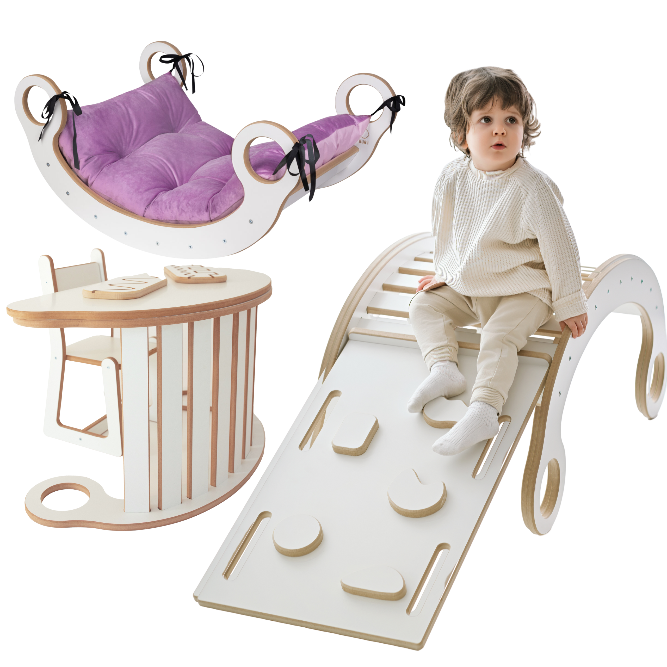 GUGI Drewniany Bujak Montessori XL + Ścianka Wspinaczkowa / Zjeżdzalnia + Poduszka Beżowa + Krzesełko + Blat