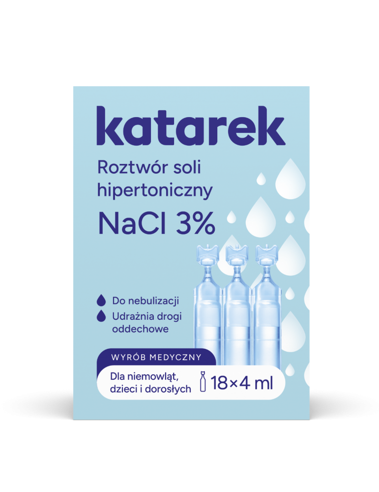Sól hipertoniczna 3% to sterylny hipertoniczny roztwór chlorku sodu (NaCl 3%), który jest przeznaczony do nebulizacji oraz udrażniania dróg oddechowych. Katarek Roztwór soli hipertoniczny wspomaga usuwanie wydzieliny z dolnych dróg oddechowych dzięki działaniu osmotycznemu, co jest szczególnie przydatne w przypadku mukowiscydozy, rozstrzeni oskrzeli czy zapalenia oskrzelików. Zapobiega również wysuszaniu błon śluzowych oskrzeli. Może być stosowany u niemowląt, dzieci i dorosłych z użyciem nebulizatorów pneumatycznych lub ultradźwiękowych – najlepiej po konsultacji z lekarzem.