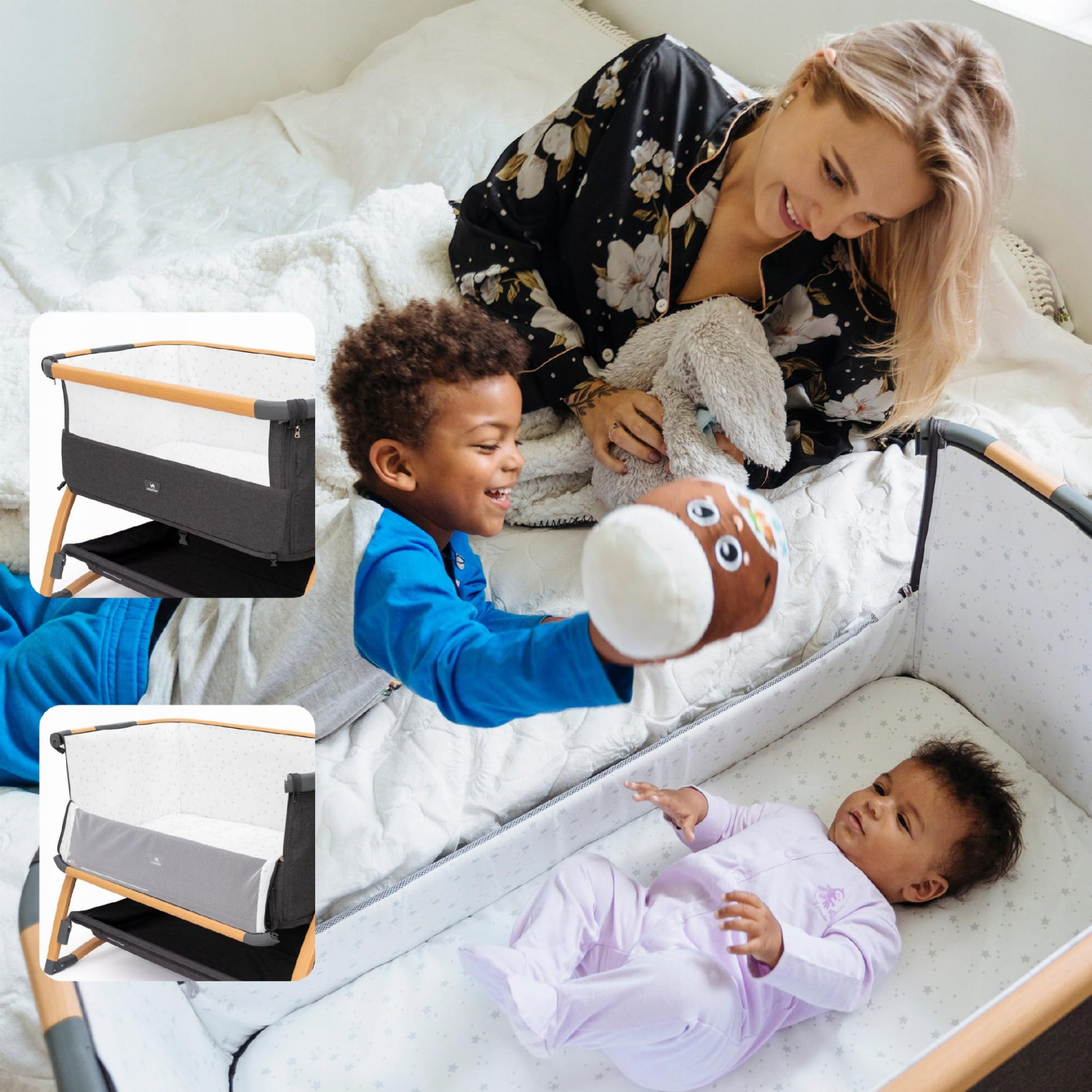 WSZECHSTRONNY I PRAKTYCZNY DESIGN: 7-stopniowa regulacja wysokości umożliwia dopasowanie do różnych typów łóżek. Otwierana ścianka boczna zapewnia łatwy dostęp do karmienia i przewijania. Funkcja kołyski uspokaja dziecko i daje poczucie bezpieczeństwa.