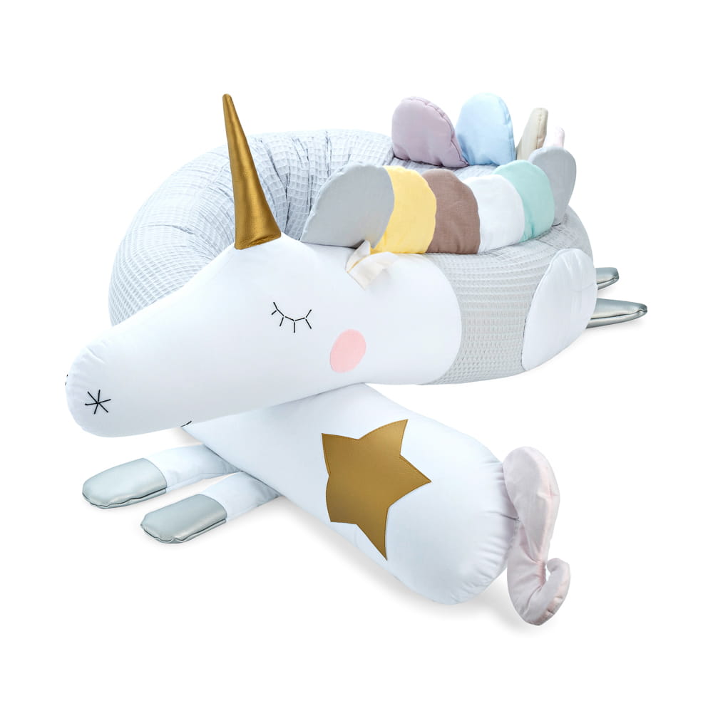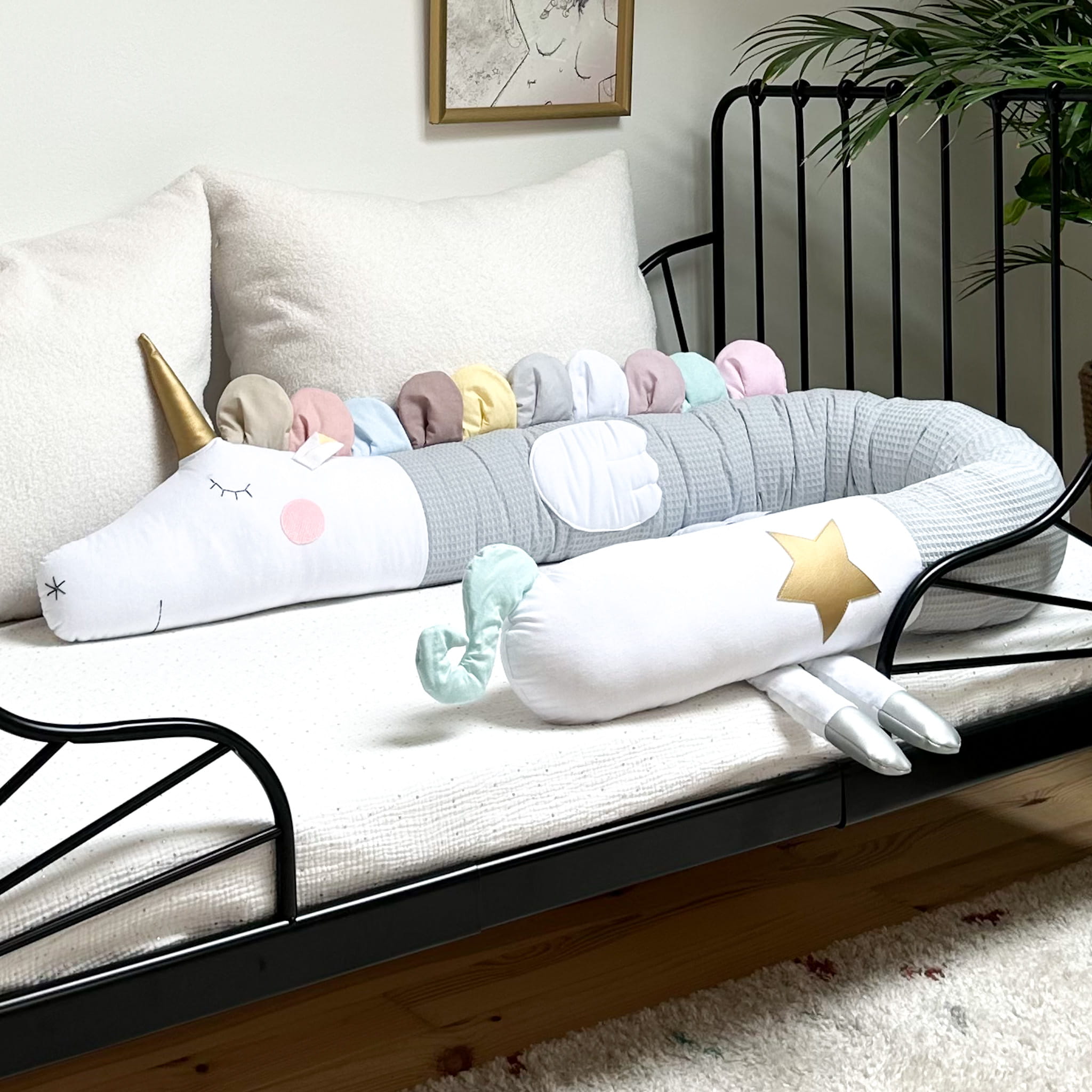 Ochraniacz, sprawdzi się również jako dekoracja na łóżko, super długa poducha i niebanalna przytulanka do spania :) Jednorożec będzie niezastąpiony dla starszych dziewczynek, jako oddzielenie od zimnej ściany czy wypełnienie przestrzeni pomiędzy ramą łóżka, a zimną ścianą.