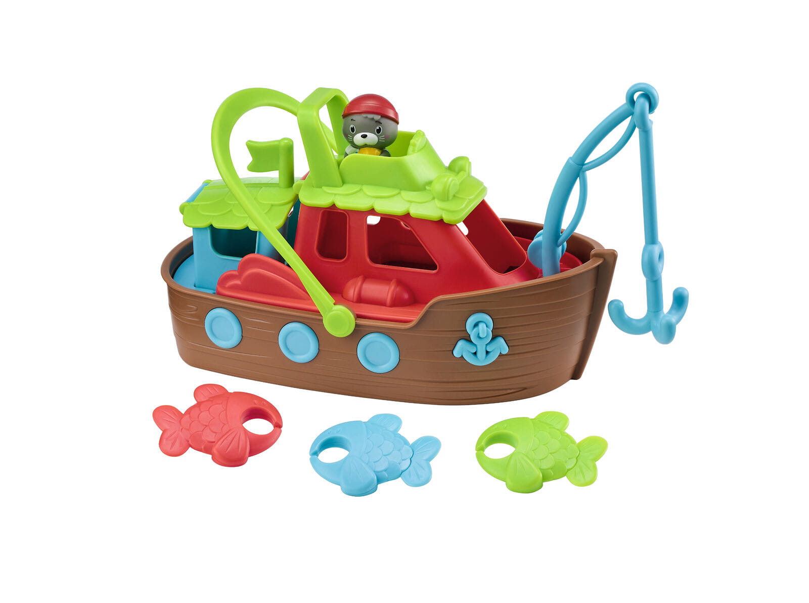 Zestaw Kuter Rybacki Klorofil zawiera: dużą łódkę z uchwytem, kuter rybacki z wędką, żaglówkę z żaglem, 3 rybki, zwierzątko morsa Malo. Dla dzieci 18 m-cy +.