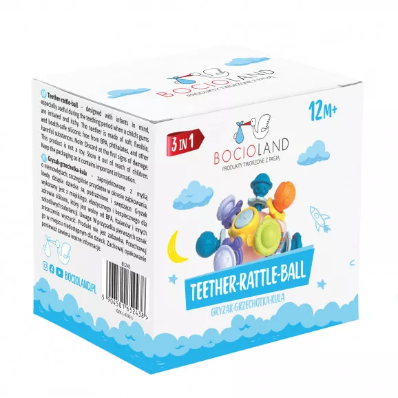 Kula sensoryczna marki Bocioland to innowacyjna zabawka 3w1, która stanowi idealne połączenie gryzaka, grzechotki i kreatywnej edukacji Montessori.