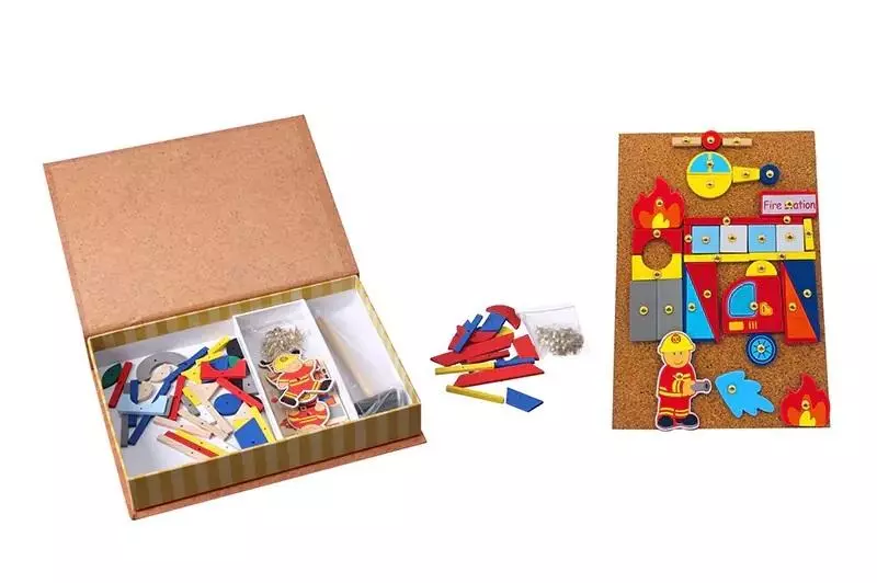 W zestawie: 4 dwustronne karty wzorów, drewniany młotek, 79 drewnianych elementów układanki, 80 gwoździ, 1 podkładka z korka, 8 tekturowych postaci, wym. Opk: 19 x 26,2 x 4,5 cm., 3+