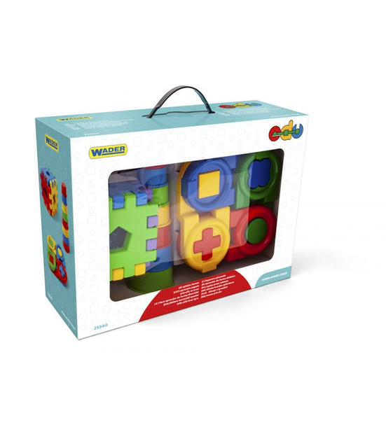 Zestaw zabawek edukacyjnych Wader, z których każda rozwija u dzieci w wieku 1-3 lat inne umiejętności kluczowe dla ich dalszego rozwoju. Zestaw zawiera domek do sortowania, wieżę rozwojową i układankę domino. Domek do sortowania składa się z 6 kolorowych ścianek z otworami na klocki w kształcie koła, trójkąta, rombu, krzyża, pięciokąta i gwiazdy, a także 6 klocków odpowiadających otworom w ściankach. Tworzenie ścianek i zabawa produktem wymaga od dziecka zaangażowania wielu zmysłów, użycia rąk, a tym samym rozwijania sprawności manualnej. Zabawa ćwiczy również zdolność logicznego myślenia dziecka. Kolorowa wieża, składająca się z ośmiu kubeczków, daje możliwość kreatywnej i pomysłowej zabawy, gdyż kubeczkami można bawić się na różne sposoby, np. układając wieżę, wkładając jeden w drugi. W procesie układania dziecko uczy się rozpoznawania kolorów, rozróżniania wielkości przedmiotów, poprawia koordynację i precyzję ruchów.