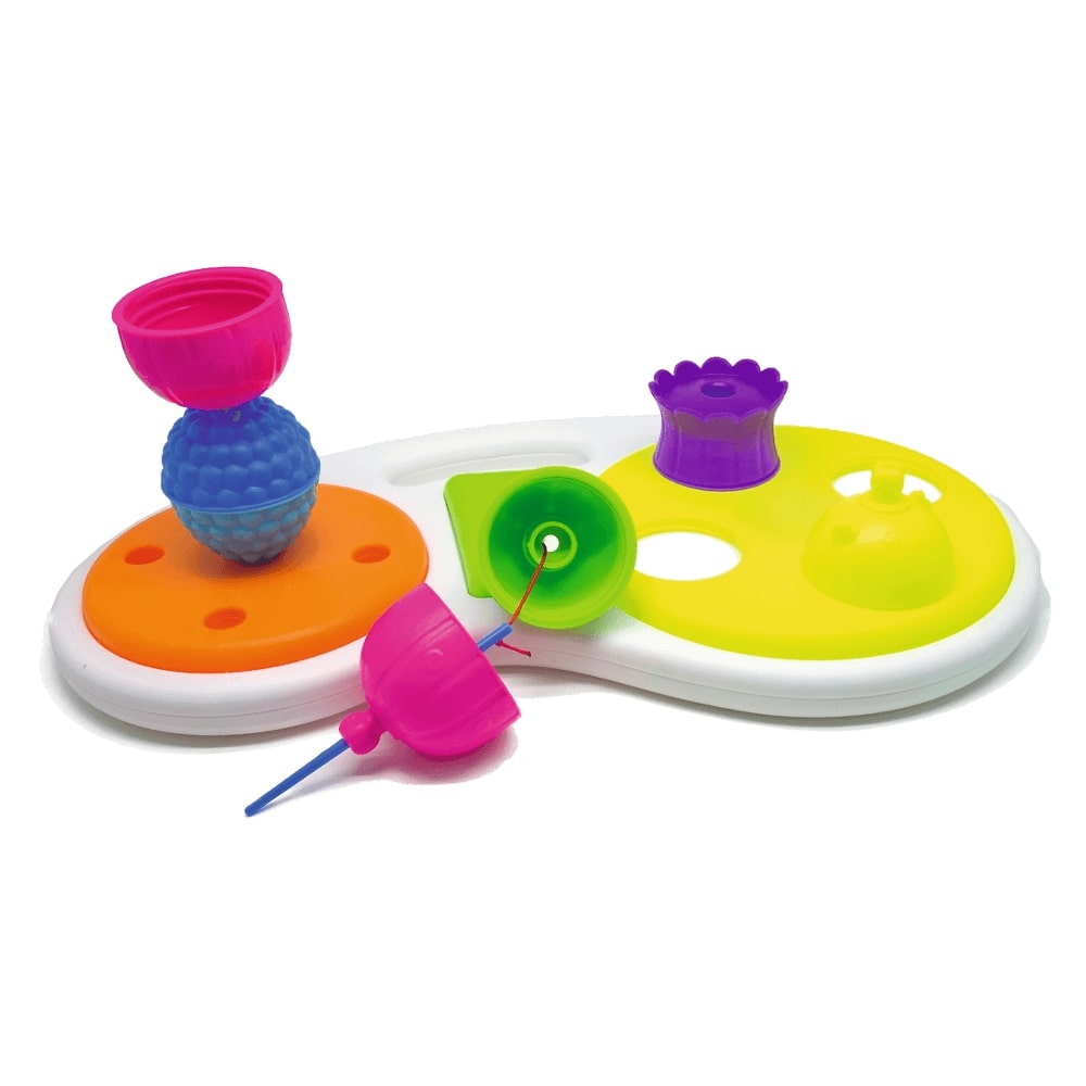 Stacja aktywności to zabawka edukacyjna, która świetnie rozwija zręczność, kreatywność i wyobraźnię. Składa się z białej platformy z uchwytem do przenoszenia. Na niej zamontowano dwie kolorowe, obrotowe podstawki z otworami do wkręcania kulko-klocków. Na środku przymocowano bezpieczny sznureczek do nawlekania kolorowych elementów. Do zestawu dołączono 6 elementów do składania kulko-klocków i jeden płatek kwiatka. Każdy kulko-klocek składa się z dwóch elementów, które można dowolnie między sobą mieszać. Co więcej, każda z części wyróżnia się inną fakturą. Wypustki, wypukłe prążki czy paski pobudzają receptory czuciowe i wpływają na integrację sensoryczną. Zabawka dostarcza zróżnicowanych wrażeń dotykowych i wzrokowych. Skręcanie i składanie klocków ma doskonały wpływ na tzw. małą motorykę dłoni, umiejętności koordynacyjne i manualne.