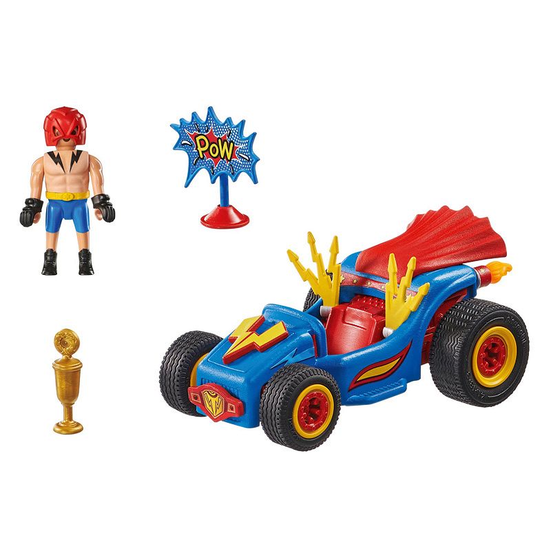 Na miejsca, gotowi... Wrestler bez wahania startuje swoim gokartem z silnikiem typu pull-back. Podczas wyścigu jego znakiem rozpoznawczym są błyskawice, trzepocząca peleryna, ogień z rury wydechowej - z łatwością wyprzedza przeciwników. Szybkie wyścigi, jazda wokół przeszkód lub szalone akrobacje - PLAYMOBIL Funstars są gotowe do startu!