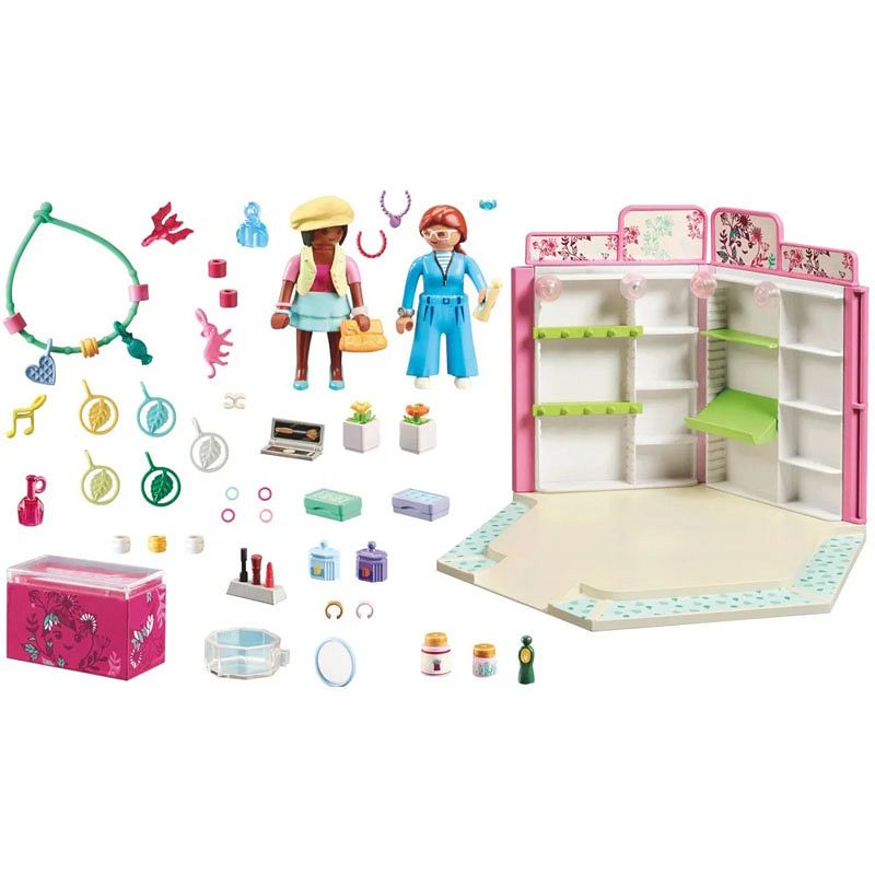 - Uroczo zaprojektowany salon piękności z dwiema figurkami PLAYMOBIL, gablotą sprzedażową, pudełkami, bransoletkami, gwiazdkami, szminką i wieloma innymi przyborami do makijażu i biżuterią.