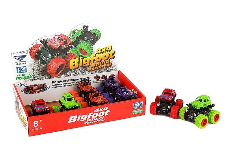 Opis: 8 szt/disp , dł. auta 9 cm, napęd frykcyjny, wysokie zawieszenie, amortyzatory, gumowe opony, wym. disp. 34,5 x 18,5 x 7,5 cm, 3+