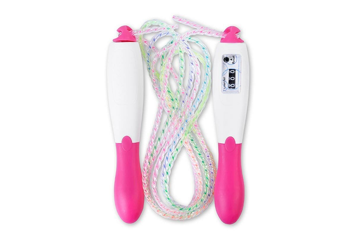 Opis: sznurek nylonowy, grubość 5 mm, długość skakanki: 2,4 m., rączki plastikowe, z licznikiem, 3 kolory: różowy, niebieski, zielony, wym. opk: 14 x 26 x 3 cm., 6+