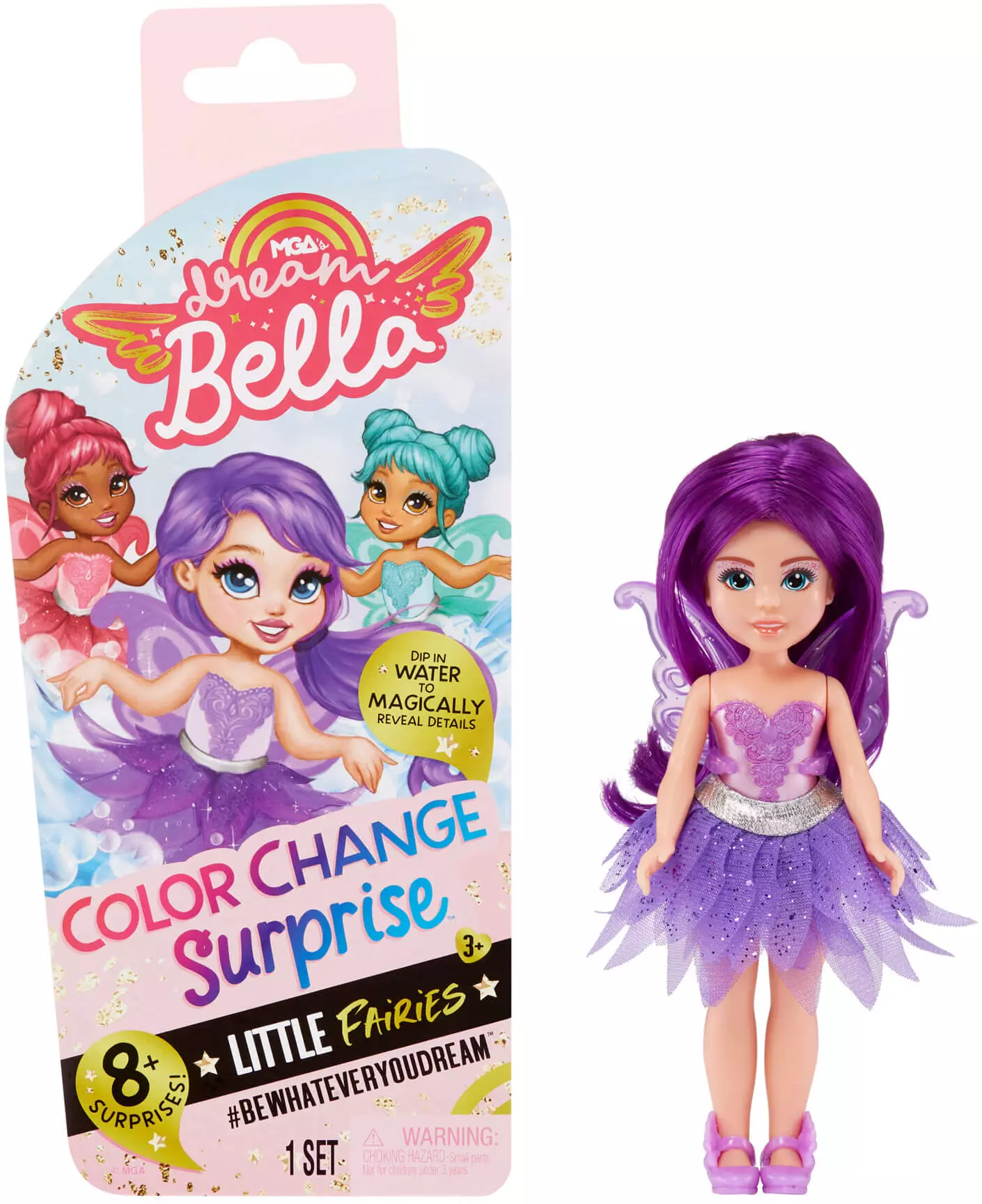 Lalki „Dream Bella. Color Change Surprise” firmy MGA zapewniają pełne niespodzianek doświadczenie podczas rozpakowywania! W każdym opakowaniu znajduje się lalka do przebierania, ale wygląd każdej z nich pozostaje tajemnicą, dopóki nie zostanie odkryty poprzez zabawę w zmianę kolorów. Następnie dziewczynki odkryją uroczą lalkę z peruką, skrzydełkami, bucikami i spódniczkami.