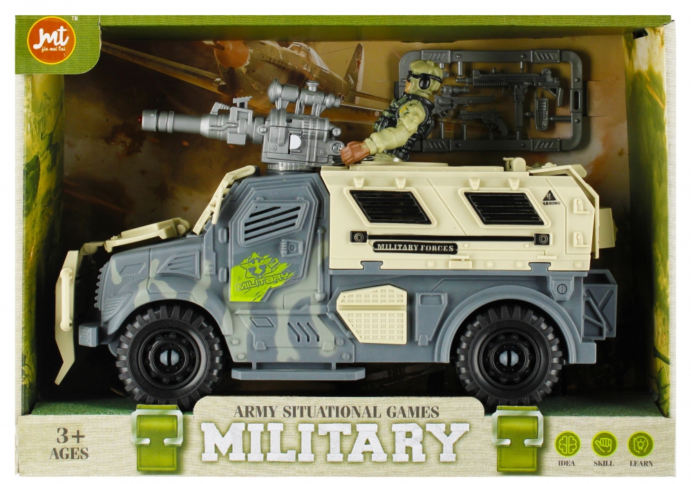 Zalety produktu samochód posiada figurkę żołnierza, posiada efekty dźwiękowe oraz świetlne, posiada ruchome elementy. Wojskowy samochód do działań specjalnych od MEGA CREATIVE Zawartość zestawu samochód wojskowy, figurka żołnierza, akcesoria wojskowe. Całość wykonana z plastiku. Wymiary/waga/baterie wymiary produktu dł. x wys. x gł. cm 23x16x8, wymiary opakowania dł. x wys. x gł. cm 28x20x8, waga produktu bez opakowania kg 0,20 kg, waga produktu w opakowaniu kg 0,33 kg, wymaga zasilania bateriami 3 x AG13- załączono do zestawu. Zabawka przeznaczona dla dzieci w wieku 3 . Pakowana w kartonik z otwartym okienkiem. W kartonie zbiorczym po 36 szt.