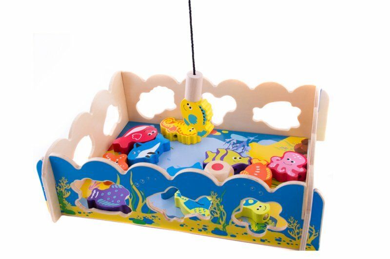 W stawie znajdują się drewaniane kolorowe rybki. Można złapać je za pomocą magnetycznej wędki. Komu uda się złowić ich jak najwięcej? Dodatkową atrakcją jest sorter do rybek, który znajduje się na bokach stawu.