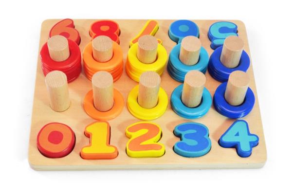 W zestawie: klocki cyferki, krążki w różnych kolorach, podstawa z palikami.